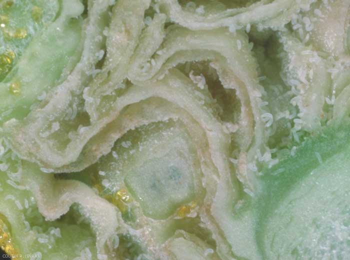 Dès les mois de juin-juillet, une partie des individus s'installe dans les bourgeons nouvellement formés. Au printemps, un bourgeon attaqué peut héberger plus de 30 000 individus (figure 4).