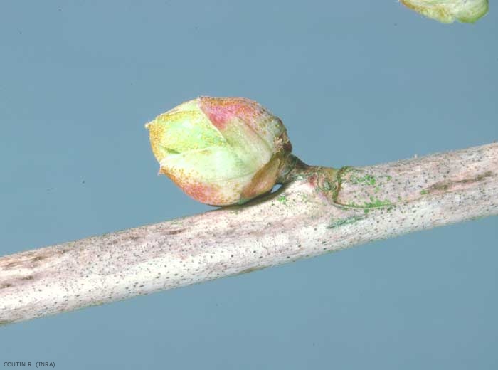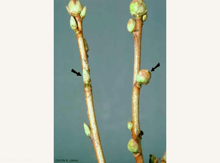 L'hibernation a lieu à l'état pré-adulte ou adulte dans les bourgeons dans lesquels les oeufs ont été pondus et que l'on reconnaît à leur aspect globuleux et hypertrophié (figure 3). A partir du mois de mars, les acariens migrent vers les feuilles et les fleurs. Ils sont fréquemment emportés par le vent qui assure leur dissémination.