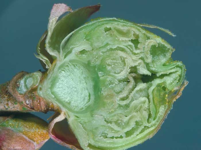 Dans les cultures intensives, les dégâts peuvent être très graves. Les bourgeons infestés se déforment, se dessèchent et meurent ou bien éclosent mais les feuilles sont crispées (figure 2). Les feuilles du groseillier à maquereau présentent des déformations caractéristiques.