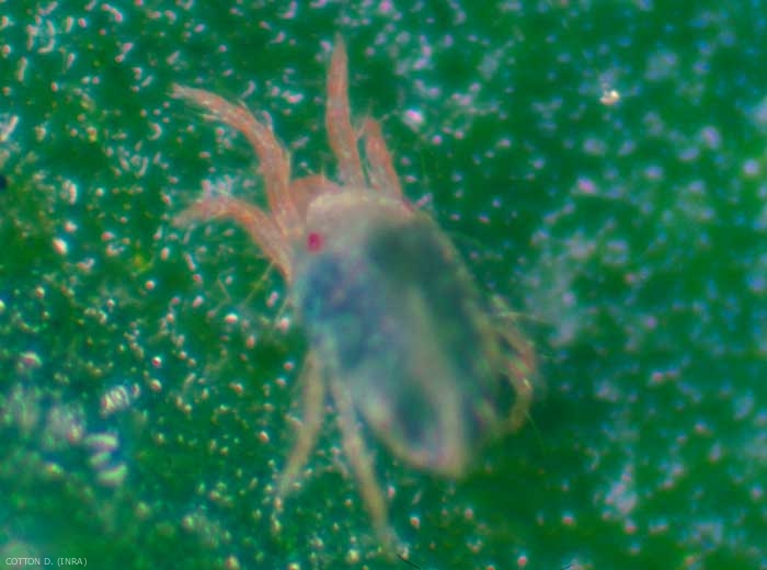 La femelle est orange clair, de forme ovale et mesure 0,44 mm de long alors que le mâle ne mesure que 0,29 mm et son abdomen plus pointu. Plusieurs paires de points noirs ornent la partie postérieure de l'abdomen ce qui permet de le distinguer de l'acarien à 2 points (Tetranychus urticae). Les pattes sont de la même couleur que le corps.