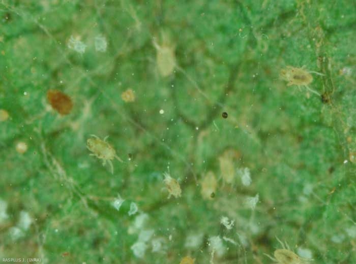 Les feuilles sont assemblées par les fils tissés par le tétranyque. L'attaque se manifeste d'abord par des ponctuations (dues au prélèvement de la chlorophylle), puis, si elle se poursuit, les feuilles rougissent et tombent. Lorsque les feuilles terminales sont attaquées, elles se crispent.