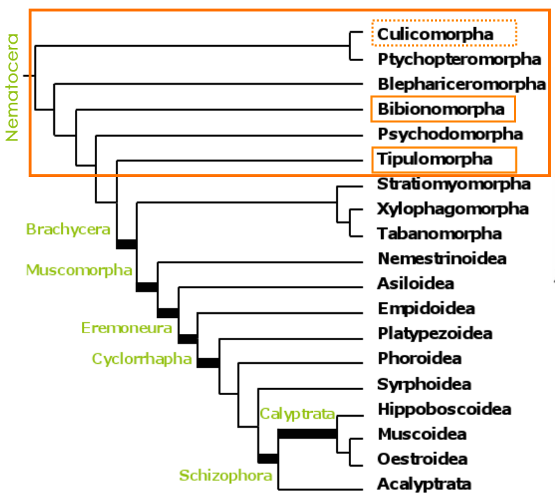 Ce sont des diptères primitifs ou Inférieurs. L'apparition des premiers culicimorphes aurait eu lieu au Trias vers 200-230 millions d’années. Ce groupe est subdivisé en 6 infra-ordres dont 2 comprenant la quasi-totalité des familles d’importance agronomique (voir figure 1).
