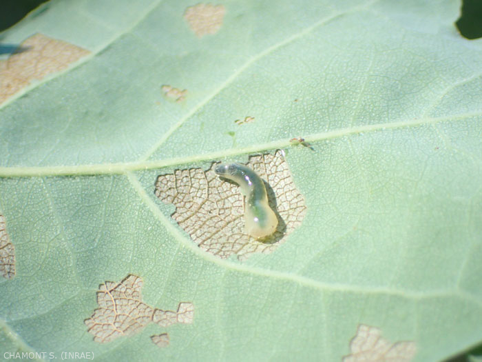 Sur feuillus (chêne, tilleul, bouleau, hêtre, etc.) on peut observer la larve fausse limace de Caliroa annulipes (Klug, 1816) qui ronge la face inférieure de la feuille (photo). De même la larve de la tenthrède limace, Caliroa cerasi (Linnaeus, 1758) ronge les les feuilles des arbres fruitiers (figure).