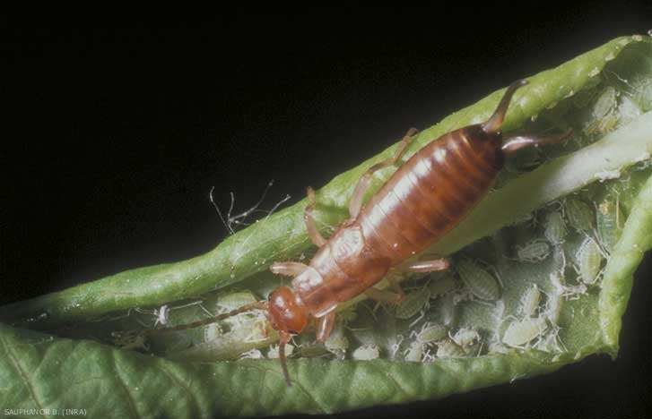 Le perce-oreille ou forficule (Dermaptera, Forficulidae) est un insecte muni de pièces buccales broyeuses, grand consommateur de pucerons (figure) et à ce titre est considéré comme un bon auxiliaire. Ce prédateur est essentiellement à activité nocturne.