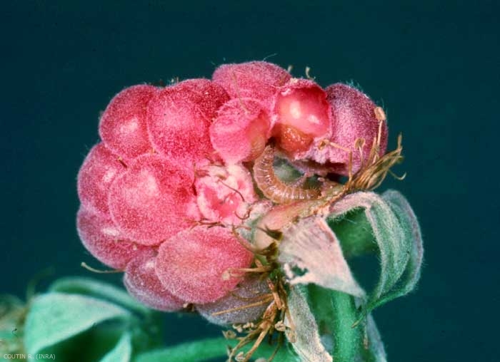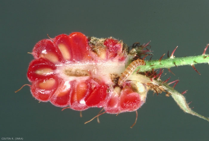 En s'attaquant aux jeunes fruits en croissance, les larves provoquent leur déformation, un ralentissement de la croissance des drupes, leur coloration anormale et parfois, si plusieurs larves sont présentes à la base du même fruit, leur dessèchement. La larve ronge aussi la base du réceptacle puis creuse des galeries sinueuses dans le jeune fruit et consomme les drupes (figure 4). C'est l'un des ravageurs les plus dangereux pour le framboisier cultivé sous ombrière.