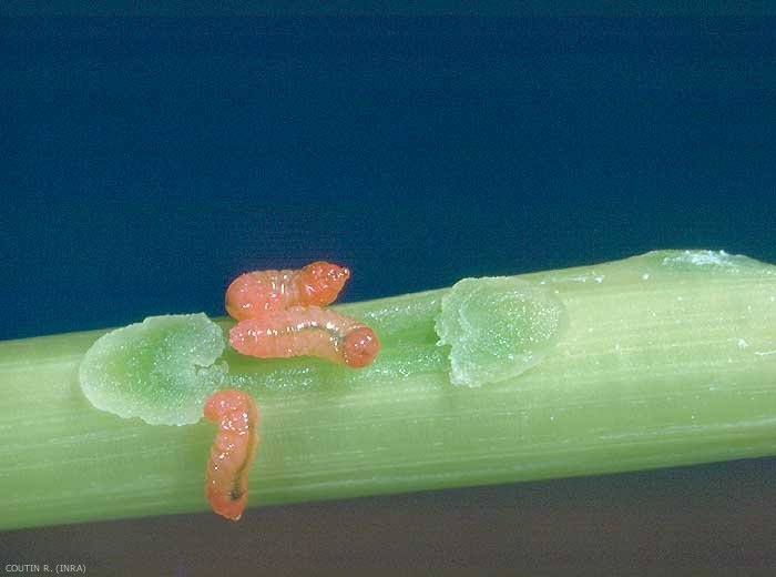 Après leur éclosion, les larves descendent dans les gaines foliaires vers un noeud du chaume sur lequel elles provoquent, par les ponctions qu'elles opèrent, des renflements transversaux caractéristiques. Après avoir atteint leur taille adulte, fin juin ou en juillet, les larves restent en diapause dans le sol entre 6 et 10 cm sous la surface.