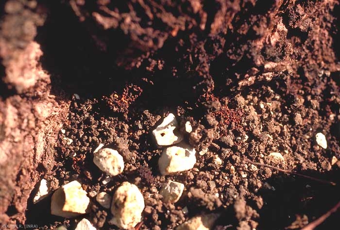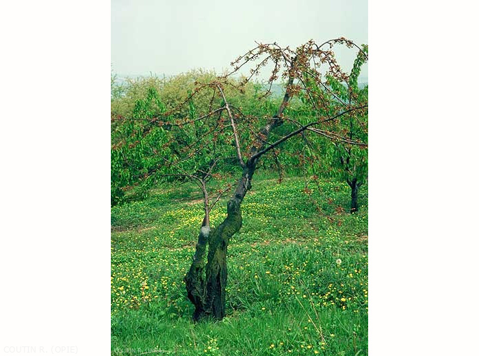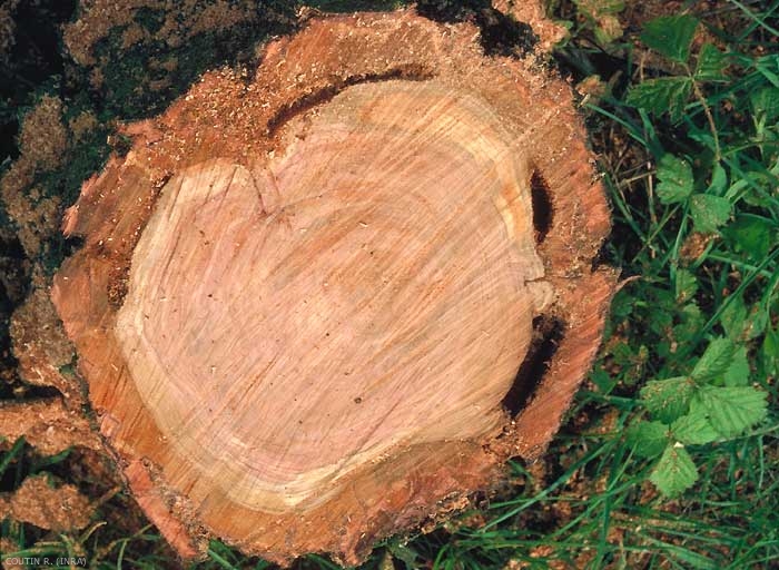La vermoulure très odorante, et de couleur rougeâtre, signale l'attaque. On trouve généralement plusieurs chenilles dans un même tronc. La chenille pénètre très profondément dans le bois et peut même forer le coeur de l'arbre. Certains arbres, tel l'orme (Ulmus sp.), sont très résistants. Les arbres fruitiers, notamment le cerisier et le pommier, plus sensibles, en meurent rapidement (figure 4). Dans les vergers, le gâte-bois s'attaque le plus souvent aux vieux sujets décrépis ou blessés dans lesquels la sève circule mal.