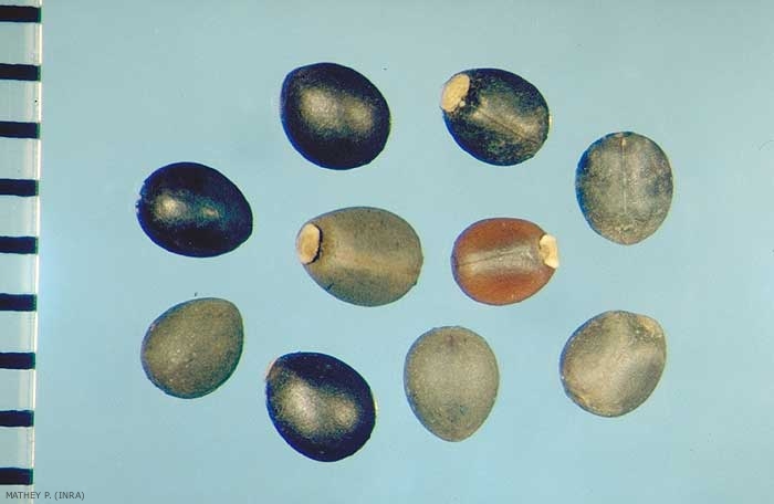 Forme : semence ovoïde légèrement comprimée dorso ventralement. Caroncule réniforme de 0,25 x 0,5 mm