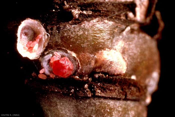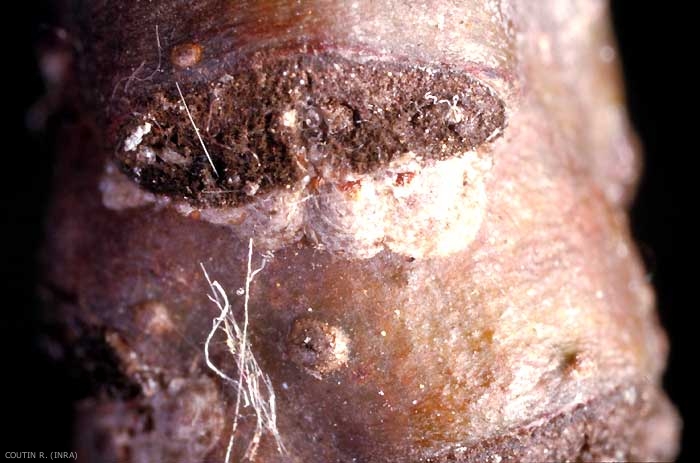 Les piqûres d'alimentation des adultes et des larves provoquent des retards de végétation, des fentes et des déformations des organes (figure 3). En cas d'attaque importante, les encroûtements provoquent le dessèchement des branches et des rameaux et la production fruitière est réduite. Le pommier est peu sensible. Le prunier et surtout le pêcher réagissent par des sécrétions gommeuses.