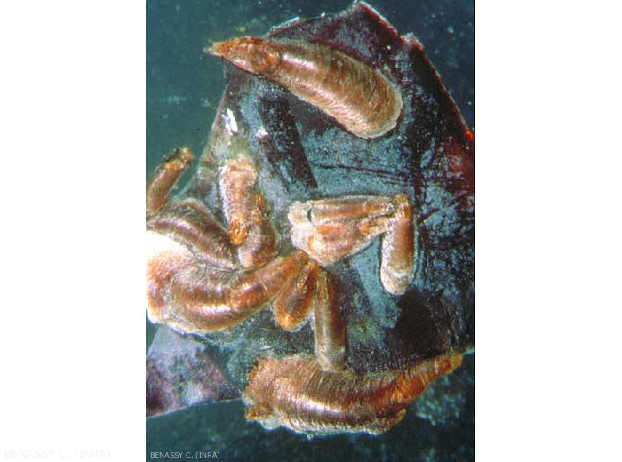 A l'automne, les femelles se reproduisent par parthénogenèse. Chaque femelle pond 40 à 80 oeufs puis meurt, laissant les oeufs hivernant à ses côtés, sous le bouclier (figure 1). Les individus se nourrissent en ponctionnant le contenu des cellules du végétal.