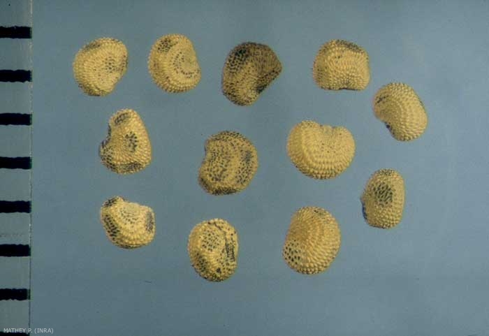 Forme : graine réniforme à bord caréné et faces latérales aplaties ;