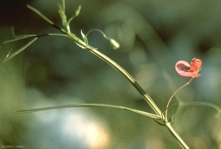 Feuilles à pétiole court et à ailes très étroites ; une paire de folioles lancéolées étroites ; feuilles inférieures avec une arête, feuilles supérieures à vrille ramifiée ;