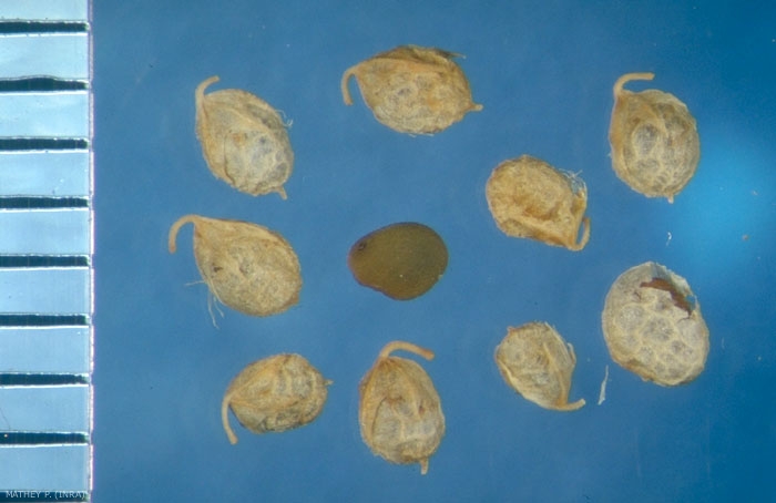 Forme : ellipsoïde avec hernie radiculaire ne dépassant pas les 2/3 du côté de la graine ; pas de V micropylaire visible ;