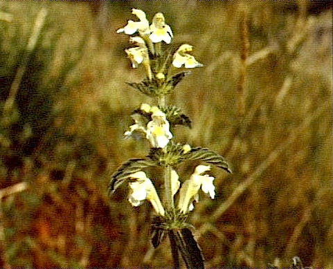 Fleurs jaune-clair ou rose de 25 à 35 mm de long, en verticille. Lèvre supérieure dressée en casque. Lèvre inférieure trilobée, lobe médian plus long que large, et le plus grand. Pseudo-verticille le plus souvent avec seulement de 4 à 8 fleurs. Calice campanulé, étroit, à 10 nervures et 5 dents presque égales, terminées par une arête épineuse, dents de 2 à 4 mm