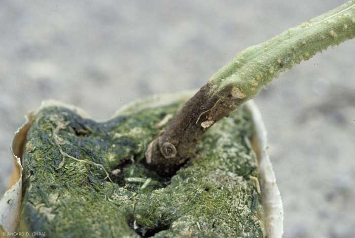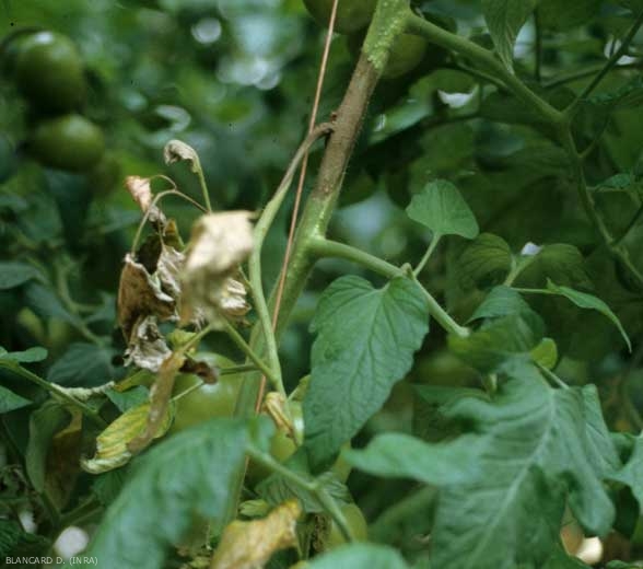 Les chancres, plutôt humides et de couleur brun sombre, s'initient au collet et au niveau des plaies de taille ainsi qu'au niveau des blessures d'effeuillage et d'ébourgeonnage. Ils s'étendent et ceinturent progressivement la tige et/ou les pétioles, perturbant ainsi les courants de sève. A terme, on constate le jaunissement, le flétrissement et le dessèchement des folioles situées en aval des lésions (figures 1 et 2).