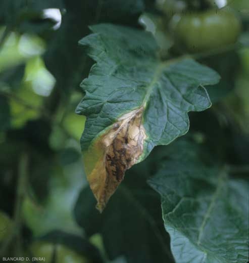 Des taches d'abord brunes et humides sont aussi visibles sur les folioles. Elles se développent souvent à leur périphérie, évoluent rapidement et couvrent des secteurs parfois importants du limbe. Des motifs bruns en arabesques plus ou moins concentriques sont visibles sur les tissus lésés. Ces taches, souvent chlorotiques en périphérie, finissent par se nécroser et se dessécher (figure 3).