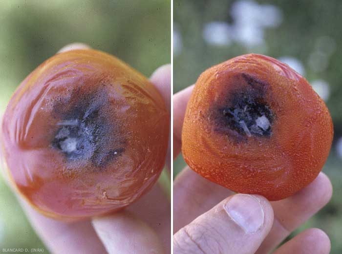 Des lésions peuvent être visibles parfois sur fruits, essentiellement au niveau de la cicatrice pédonculaire. Celles-ci sont humides, noires et donnent l'impression de se développer sous la forme d'anneaux concentriques donnant lieu, à terme, à de larges taches circulaires (figure 4).