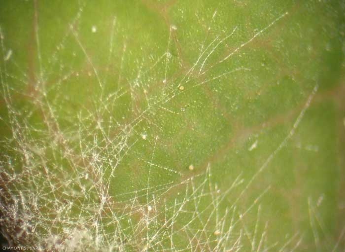 Comme tous les oïdium, Podosphaera pannosa développe son mycélium à la surface des organes contaminés (figure 1) et parasite les cellules épidermiques en émettant des haustoria qui pénètrent dans celles-ci afin d'utiliser les métabolites de la plante hôte. Lorsque les conditions deviennent favorables, le mycélium sporule à la surface de la feuille (figure 2).