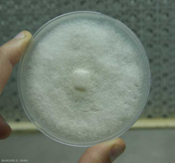 Contrairement aux autres oomycètes responsables de mildiou, Phytophthora infestans peut se cultiver en boite de Pétri sur milieu artificiel à base de petits pois (figure 4).