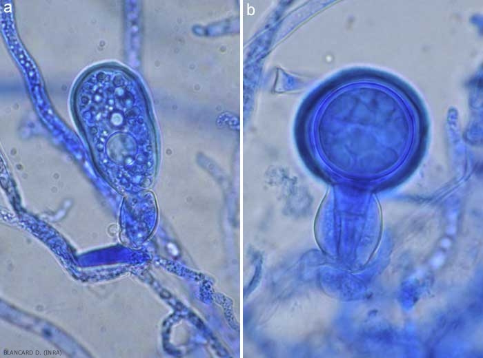 Ce chromiste hétérothallique nécessite pour sa reproduction sexuée la présence de souches appartenant à deux groupes de compatibilité complémentaires. L'hyphe femelle se développe à travers la jeune anthéridie (hyphe mâle) et produit une oogone globuleuse (figure 3) placée au-dessus de l'anthéridie. L'anthéridie alors féconde l'oogone, qui devient une oospore à paroi épaisse.