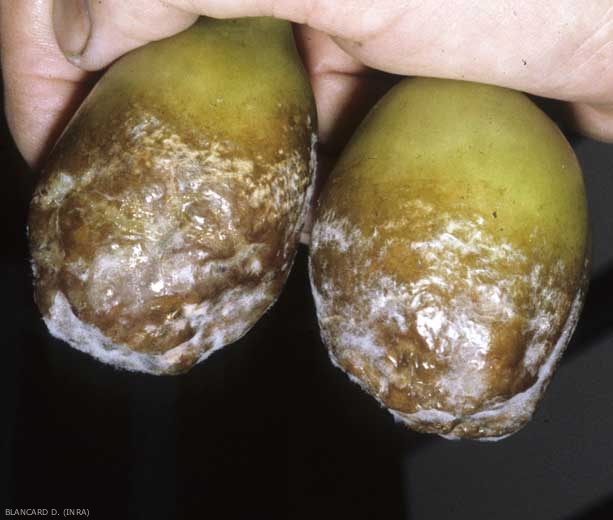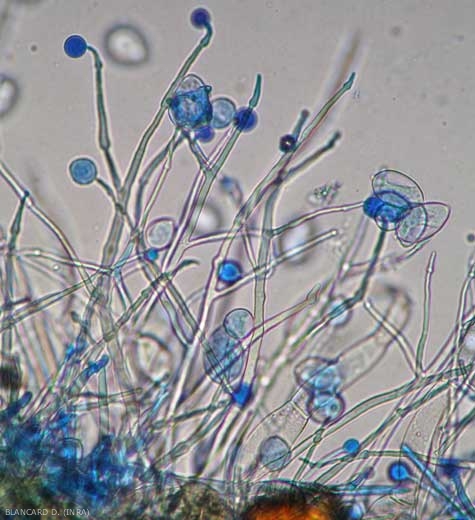 Le mycélium de Phytophthora infestans est non cloisonné comme celui de tous les oomycètes. Ce mycélium produit des sporangiophores ramifiés, que l'on peut observer à la surface des organes contaminés, lors de la sporulation (figure 1).
