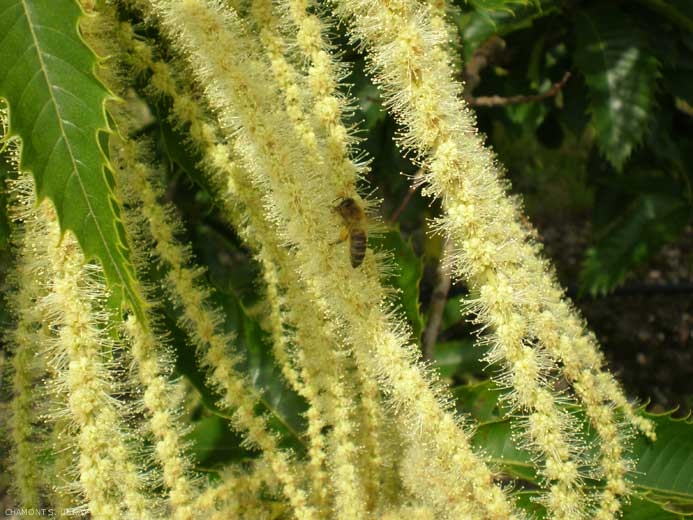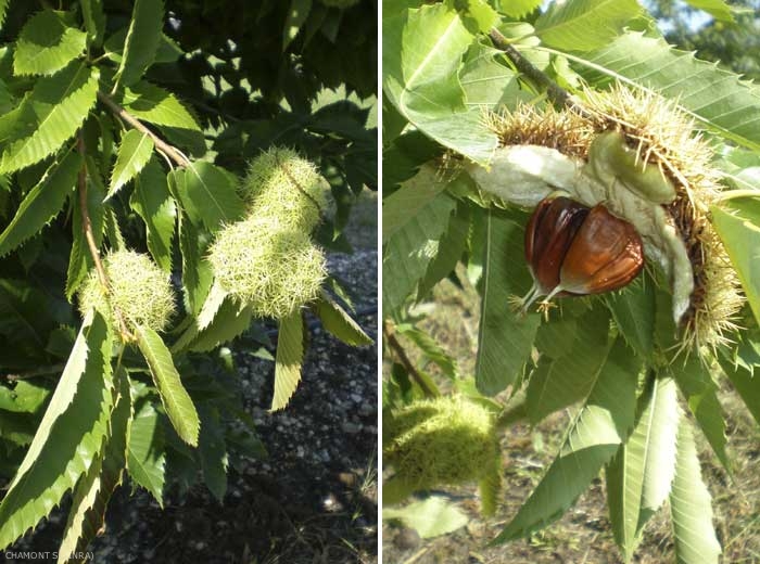 A la floraison très odorante (figure 2), les fleurs qui produisent du nectar sont visitées par les abeilles ce qui permet de produire du miel dont l'odeur est caractéristique. Les fruits (châtaignes, figure 3) sont constitués d'une bogue épineuse contenant 2 ou 3 châtaignes, que l'on consomme à l'état frais, bouillis ou grillés, ou confits dans du sucre (marrons glacés). Ils ont constitué longtemps la base de l'alimentation pour les hommes et les animaux.