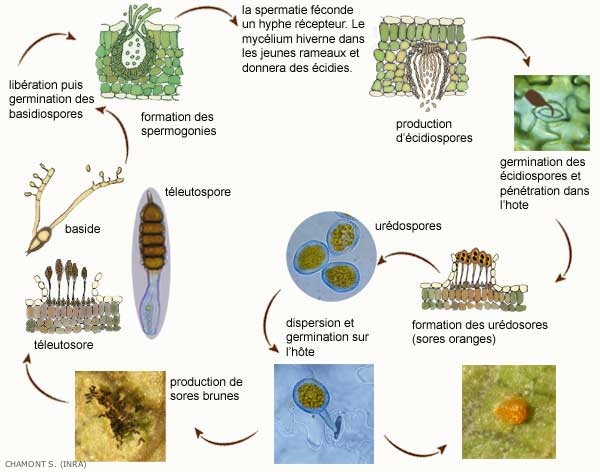 A la suite des premières contaminations printanières, la reproduction et la dissémination du champignon sont assurées par la production d'écidiospores et d'urédospores pendant une grande partie de la période de végétation (figure 2).