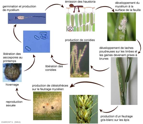 Blumeria graminis est un parasite obligatoire qui passe l'hiver en repos végétatif sur les débris de culture (sur les pailles) et les graminées sauvages, sous forme de fructifications noires (cleistothèces).