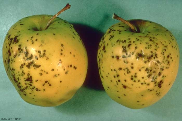 Par leur aspect et leur mode de développement, ces taches sont similaires à celles observées sur feuille à la même période. Par la suite, la surface se craquelle irrégulièrement et devient rugueuse. En attaque précoce, le fruit se dessèche en partie, se déforme, mûrit mal et peut tomber.