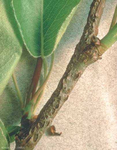 Les pousses de l'année sont les plus sensibles aux attaques. Celles-ci sont caractérisées par des pustules qui se multiplient et donnent un aspect variqueux au rameau (figure 3, dégâts de tavelure sur poirier).