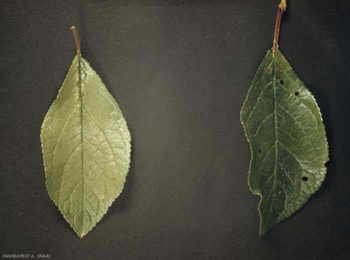 Le tissu foliaire peut se dissocier, des parties de la feuille se détacher, de telle sorte que des trous aux bords effilochés de couleur brune apparaissent. Les feuilles des rameaux touchés vont ensuite s'enrouler et se nécroser avec l'apparition de taches brun-rouille au niveau de la nervure médiane.