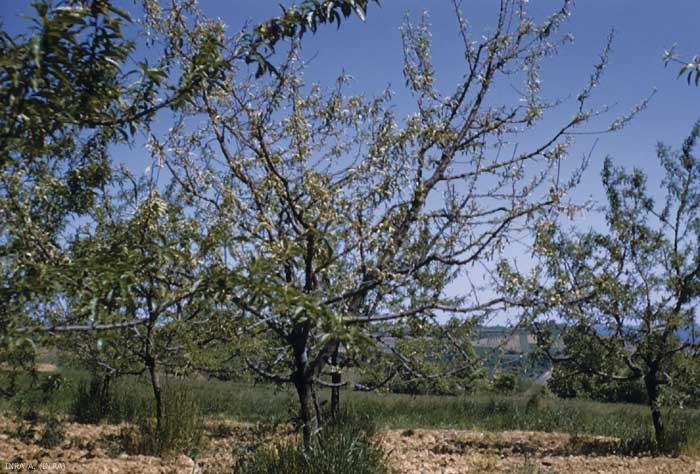 Sur les parties lignifiées, des nécroses de l'écorce (figure 3) vont se former et les extrémités des rameaux se dessécher. Un épanchement de gomme sera par la suite observé.