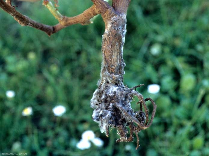 R. necatrix provoque une pourriture des racines et du collet. Celle-ci est surmontée d'un tapis de mycélium laineux blanc d'une épaisseur de 2 à 3 cm qui s'affaisse par temps froid ou sec (figure 2). Lorsque l'écorce de la racine et de la base du tronc est décollée, du mycélium interne est observé.
