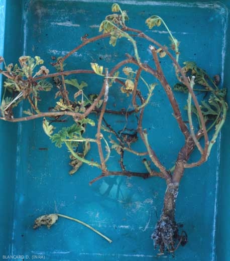 Deux types de symptômes aériens peuvent être observés sur les plantes malades :