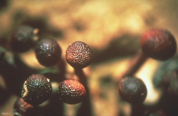 Le périthèce, organe de la reproduction sexuée, est issu de la germination des sclérotes. Il possède un stipe de 15 à 20 mm de long et 2 mm de diamètre. Ce stipe de coloration violette est surmonté d'une tête globuleuse jaune puis pourpre de 3 à 5 mm de diamètre (figure 1). Ce périthèce contient de nombreux asques de forme simple et allongée, étroits à la base. Les asques renferment 8 ascospores filiformes juxtaposées en faisceau serré mesurant de 50 à 75 µm de longueur.