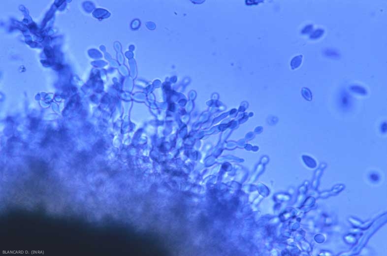 Les sporodochies de M. fructigena ont un diamètre de 2 à 3 mm alors que celles de M. laxa sont plus petites et plus fragiles. Elles comprennent un ensemble de conidiophores rudimentaires constitués de chaînes d'articles cellulaires qui se séparent et donnent des conidies unicellulaires et hyalines (macroconidies) (figure 1).