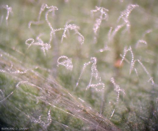 A partir du mycélium superficiel se forment les conidiophores. Ils sont plus larges que les filaments mycéliens et mesurent 500 µm de long. Ils sont érigés alors que le mycélium reste plaqué sur la cuticule de la feuille (figure 1).