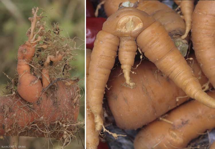 En cas d'attaque très grave et sur certaines plantes sensibles (concombre), les galles peuvent devenir très volumineuses et envahir tout le système racinaire qui est alors réduit à un moignon boursouflé sans aucun chevelu (figure 3). Les tubercules (carotte, pomme de terre) deviennent fourchus ou verruqueux (figure 4). La partie aérienne peut présenter une croissance réduite accompagnée d'un jaunissement des feuilles (figure 5). Les plantes infestées sont très sensibles à la sécheresse.