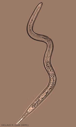 Le second stade juvénile qui va contaminer les racines passe d'un stade vermiforme à une forme enflée en forme de saucisse après l'infection. La femelle, après une période de croissance rapide, prend une forme globuleuse en poire typique, incluse dans les tissus de l'hôte et mesure environ 0,5 mm de diamètre (figures 1 et 2). Le mâle adulte est filiforme.