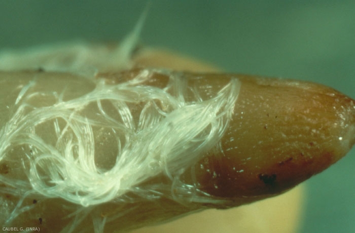 Ces cavités se traduisent par des lésions brun rougeâtre qui peuvent être très étendues. En fin de végétation, on retrouve dans ces lésions desséchées une substance cotonneuse constituée de millions d'individus à l'état d'anabiose (vie ralentie) qui constituent une réserve d'infection pour les cultures suivantes.