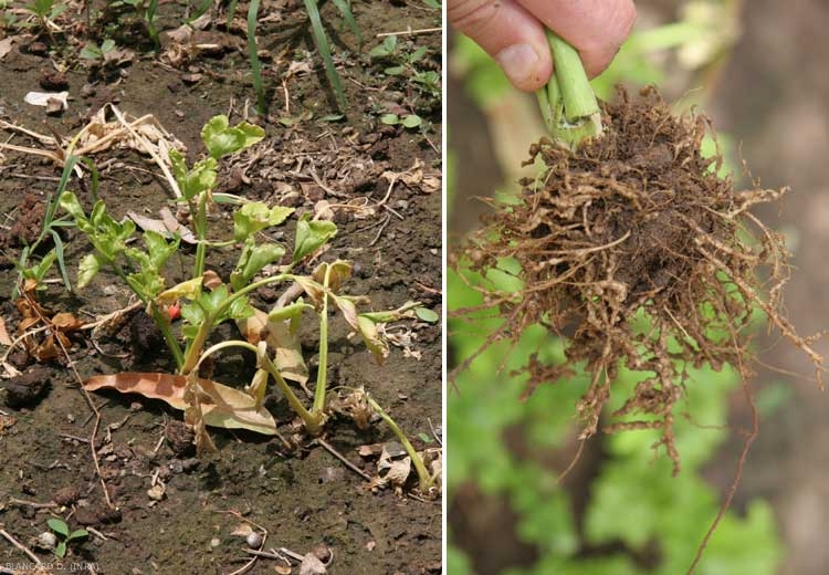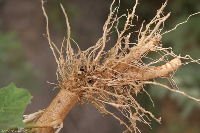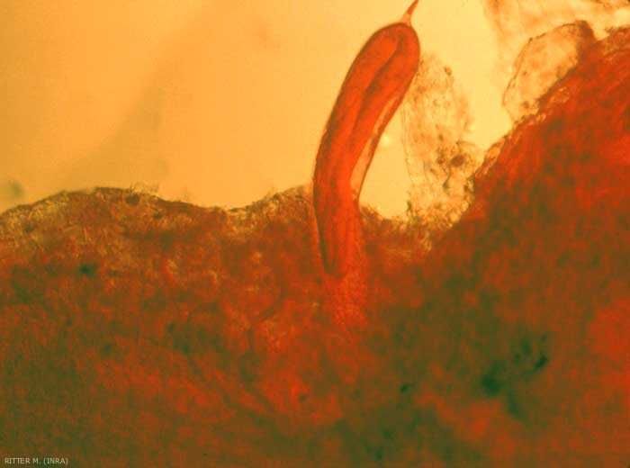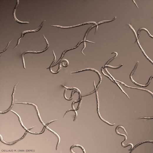 Après plusieurs mues, la larve se transforme en mâle ou en femelle. Le mâle est libéré à l'extérieur de la racine (figure 4). La femelle, immobile, reste dans les tissus et pond 1 000 à 2 000 oeufs englobés dans une gangue gélatineuse qui les maintient rassemblés. Ces masses d'oeufs font saillies à la surface des jeunes racines.