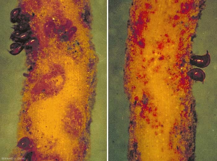 La femelle adulte, extrêmement petite, est généralement observée à la surface d'une radicelle sous forme d'un petit sac terminé par une pointe (figure 1), si la larve dont elle provient est fixée depuis peu de temps. Quand elle est plus âgée, elle est cachée au sein de la masse d'oeufs qu'elle a pondus et qui forment un amas d'environ 0,5 mm de diamètre.