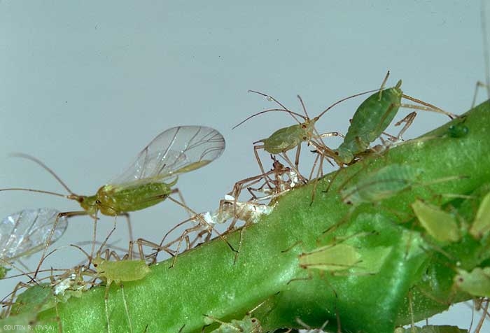 Par ailleurs, ce puceron est le principal vecteur de plusieurs viroses par exemple le virus de la mosaïque-énation du pois (PEMV, Pea enation mosaic virus), maladie importante des légumineuses cultivées (lentille, pois), le virus de l'enroulement des feuilles (BLRV, Bean leafroll virus) et le virus de la mosaïque jaune du haricot (BYMV, Bean yellow mosaic virus).