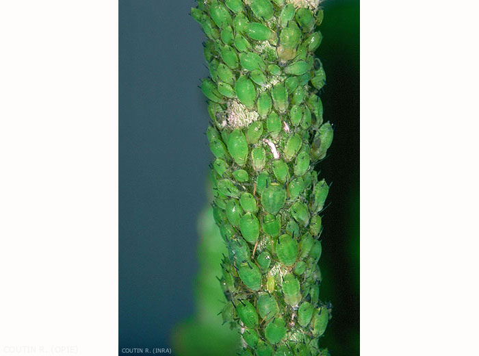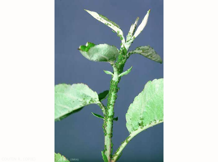 Pour se nourrir, les pucerons insèrent leur stylet dans le phloème des jeunes rameaux. Ils sont souvent groupés sur les pousses en gaines compactes pouvant atteindre plusieurs centaines d'individus (figure 2). Ils envahissent la face inférieure des feuilles terminales qui s'enroulent et se recroquevillent légèrement.