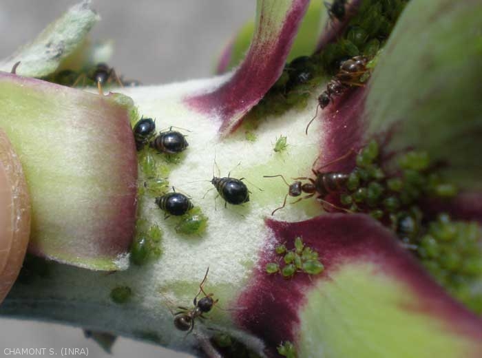 Les colonies sont particulièrement populeuses à la base des capitules et sur les feuilles caulinaires (figure 2) de ses hôtes secondaires.