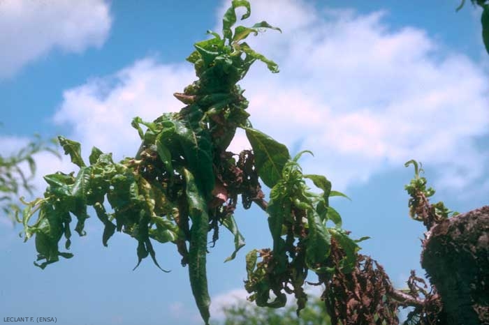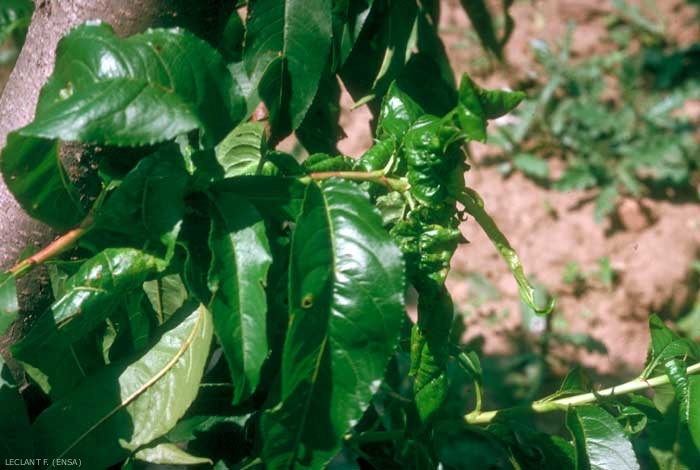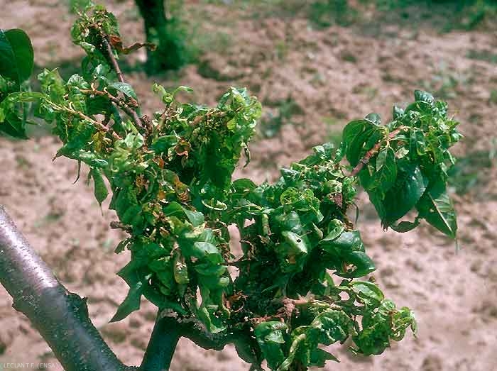 Les feuilles attaquées se recroquevillent fortement (fausse cloque), et la croissance des pousses est entravée (figures 1 à 3).