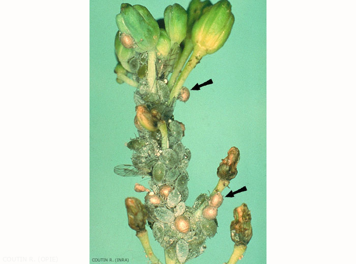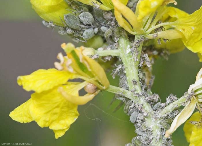 L'oeuf d'hiver, déposé à la face inférieure des feuilles ou sur les tiges, éclôt dès les mois de février-mars. La fondatrice donne naissance à des aptères virginipares constituant des colonies qui se développent progressivement, gagnant les feuilles du coeur des plantes puis formant des gaines compactes autour des hampes florales et des siliques (figures 1 et 2). Les individus ailés apparaissent alors que la population est maximale et vont coloniser de nouvelles plantes. Les colonies sont ensuite progressivement décimées par les aphidiphages (figures 2 à 4).