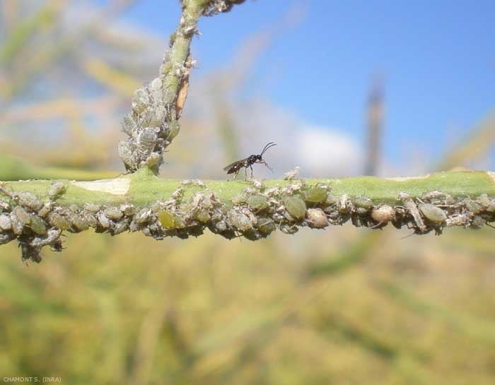 Un parasitoïde spécifique, Diaeretiella rapae (Hymenoptera, Braconidae) est utilisé au champ en lutte biologique (---> plus d'infos).