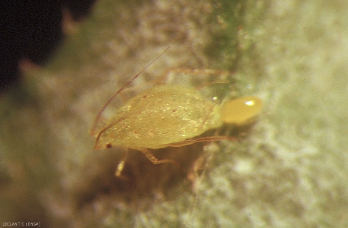 L'adulte mesure environ 2 mm donc de petite taille, il est verdâtre et difficile à apercevoir car il se confond facilement avec les feuilles (figure 1).