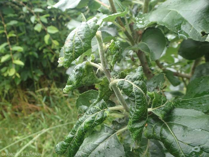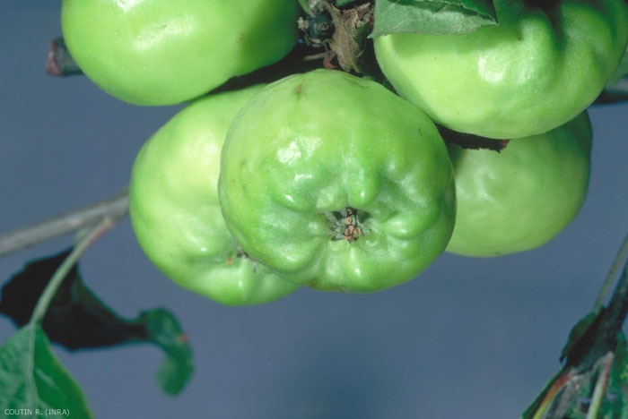 Très nuisible, ce puceron provoque, par ses piqûres, de graves déformations des organes végétaux (figure 2). Les feuilles se recroquevillent et peuvent tomber, les rameaux sont déformés, l'éclaircissage physiologique est contrarié, les fruits restent nombreux et sont petits et bosselés (figure 3).